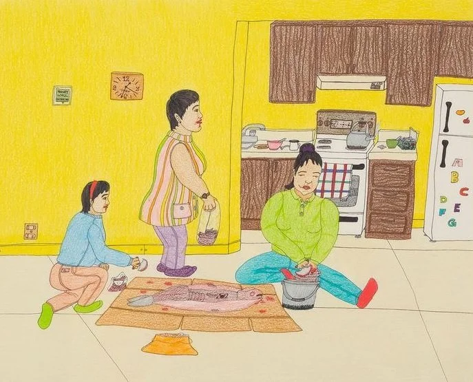 Annie Pootoogook, In the Kitchen (2006). Colored pencil and ink on paper, Pencil crayon / mixed media on paper, 38.7 × 50.2 cm. Private collection. Reproduced with the permission of the Dorset Fine Arts.