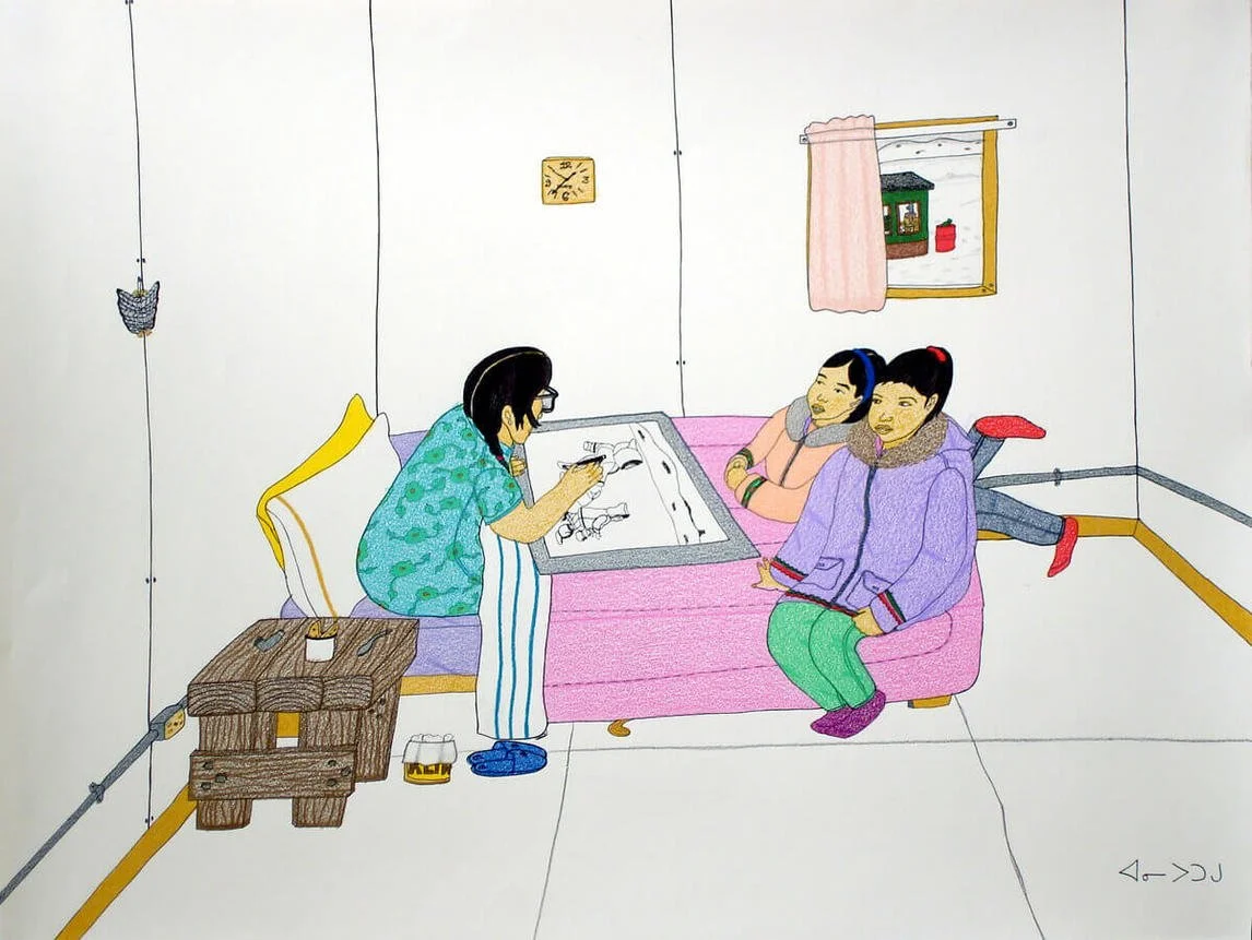 Annie Pootoogook, Pitseolak Drawing with Two Girls on Her Bed (2006). Colored pencil on paper, 50.8 × 66 cm. Private collection. Reproduced with the permission of the Dorset Fine Arts.