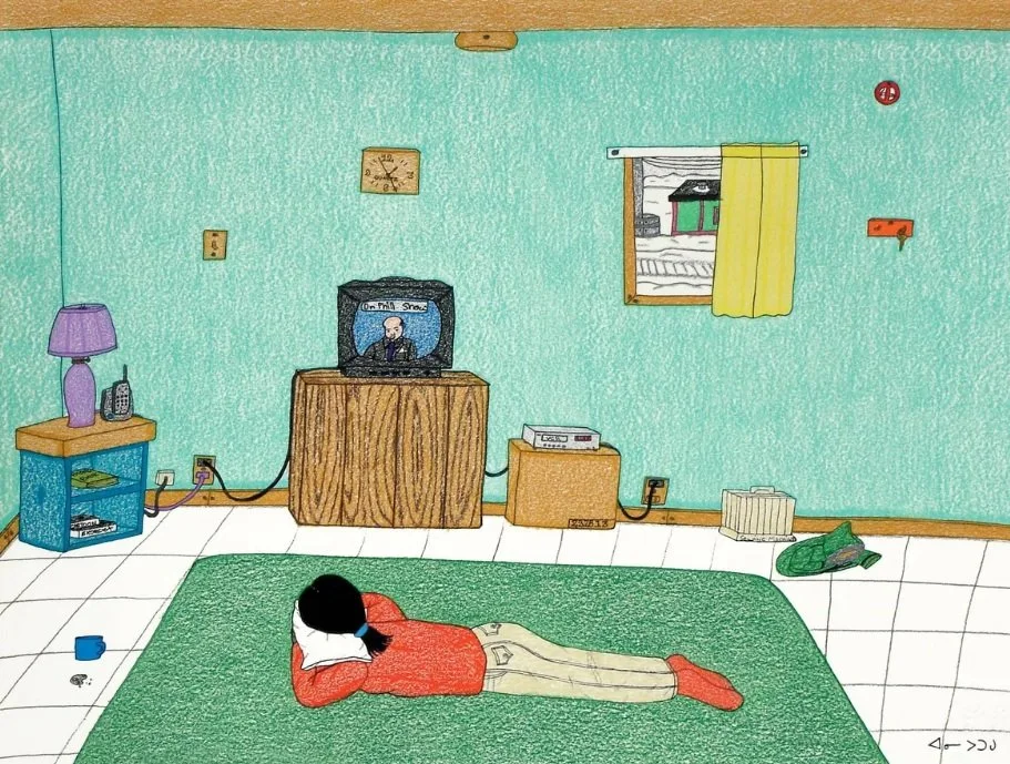 Oppositely, Pootoogook rejects mythology in her work. In a time where the Southern market had a quench for the folklore of the frigid tundra and Inuit culture, Pootoogook refutes such an impositionist imagination.[ii] As Canada attempted to carve a national artistic visual program, Inuit drawings were expected to draw upon fables, promoting a palatable cultural export. Dehistoricizing Inuit existence attempted to freeze them in a romanticized and depoliticized past, disregarding their present.[iii] Pootoogook's drawings resist erasure and assert a presence of Inuit girlhood not relegated to folklore. Her use of commercialized products spatiotemporally ground her in a contemporary reality. In Dr. Phil (2006), technology is pervasive. Two outlets have cords extending out from them, connecting a TV, a lamp, a telephone and a CD player. Almost every sense is engaged, indicating that Arctic life is not existing in isolation. Through the window, it's not nature that is seen, but another house, emphasizing the built environment and its removal from nature. Moreover, the "no smoking sign" in the top right corner indicates the trade of products from the South. Pootoogook's work reflects an interiority central to girlhood. Girlhood was experienced through a series of acts, some occasionally banal, many occurring within the home. The search for the mystical arctic landscape is a settler colonial fantasy misaligned with Inuit girlhood realities. Geography shapes a girl's life, but the mediation of autonomy occurs not with the landscape, but with the material interactions one experiences.