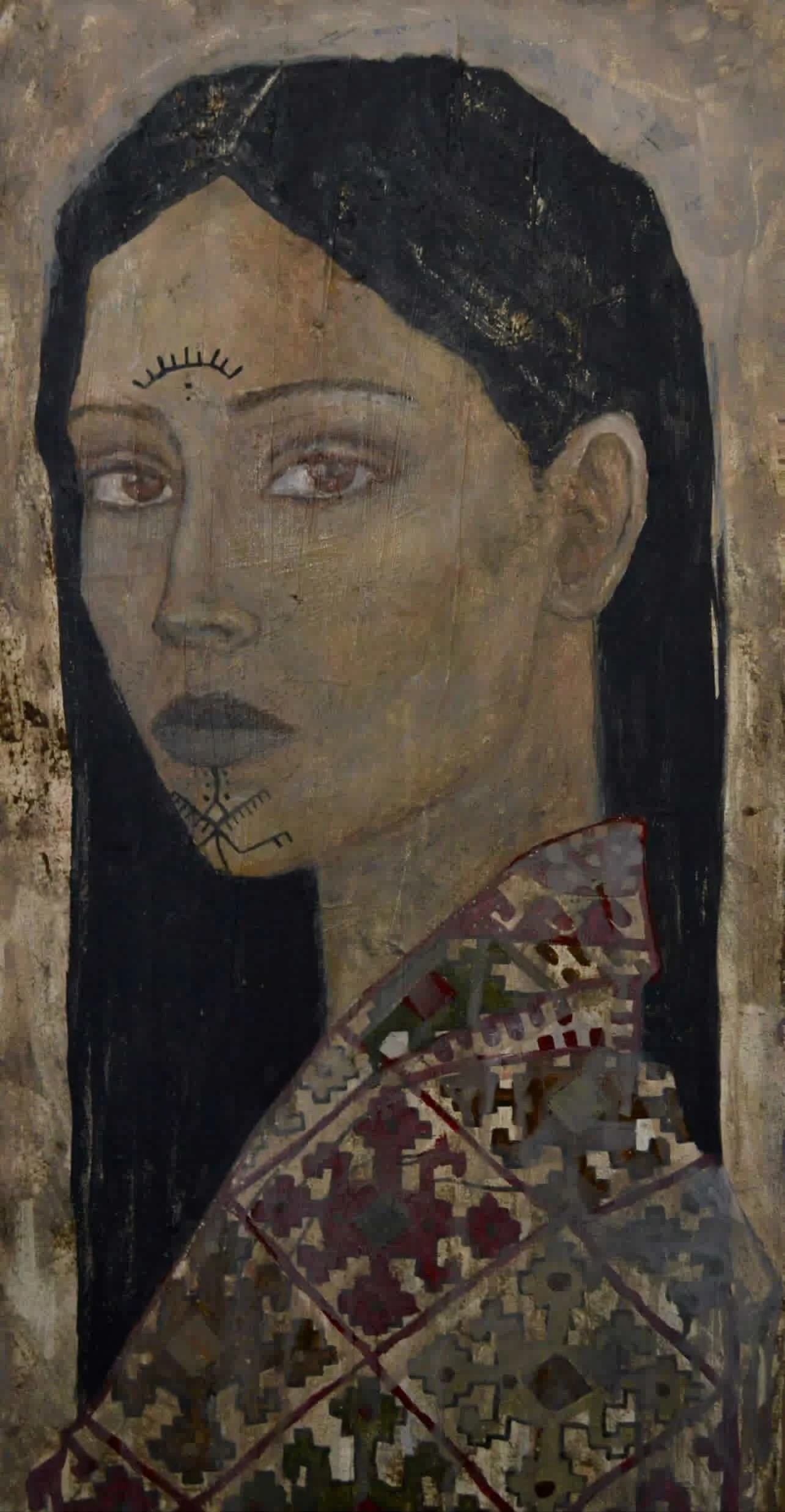 Prusha Nor, Lady of Deq (2024). Oil paint, charcoal, natural dyes, soil, nupastel. Close up. 38 × 12 inches.
