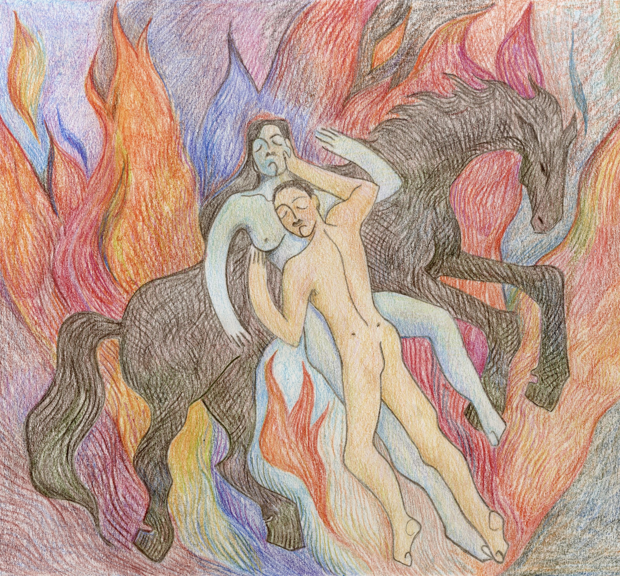 Standhaftigheten til paret som prøver å ligge med hverandre, til tross for hovedpersonen i novellens plagsomme og nifse forfølgelse, kan ses i lys av Reidar Aulies Pubertet (1937) – her tolket og gjengitt av Mikaela Augestad. Dette maleriets voldsomme og nesten klisjéaktige symbolikk gjør det vanskelig å ikke synes det er en smule morsomt, men det klare og lett tydelige poenget gjør det til et veldig brukbart bilde i vår studie av begjæret. Aulie har malt en gutt liggende oppå en jente midt i akten. Jeg synes det er verdt å nevne at nytelsen ser ut til å være ganske ensidig. Gutten er malt i varme farger og presser seg på jenta malt i kalde, som best kan beskrives som uimponert. Bak dem igjen finner vi en hingst i eksplosiv galopp. Det er nettopp denne eksplosive kraften som ligger til grunne i begjæret. Det er dette som får mannen i paret til å «rase og slå» og «gripe en sten og kaste den» mot hjemsøkeren.[3] Flammene som omfavner dem forsterker forestillingen om begjæret som en brennende kraft hos både paret på bildet og i Stenersens novelle. Med ordene fra "jeg-ets" første møte med paret, er lidenskapen mellom dem så sterk at de blir som «et bål jeg måtte se brenne».[4] Gjennom dette forstår vi den sterke lysten hos begge par, som gjør at de skal ha hverandre, samme hva det innebærer.
