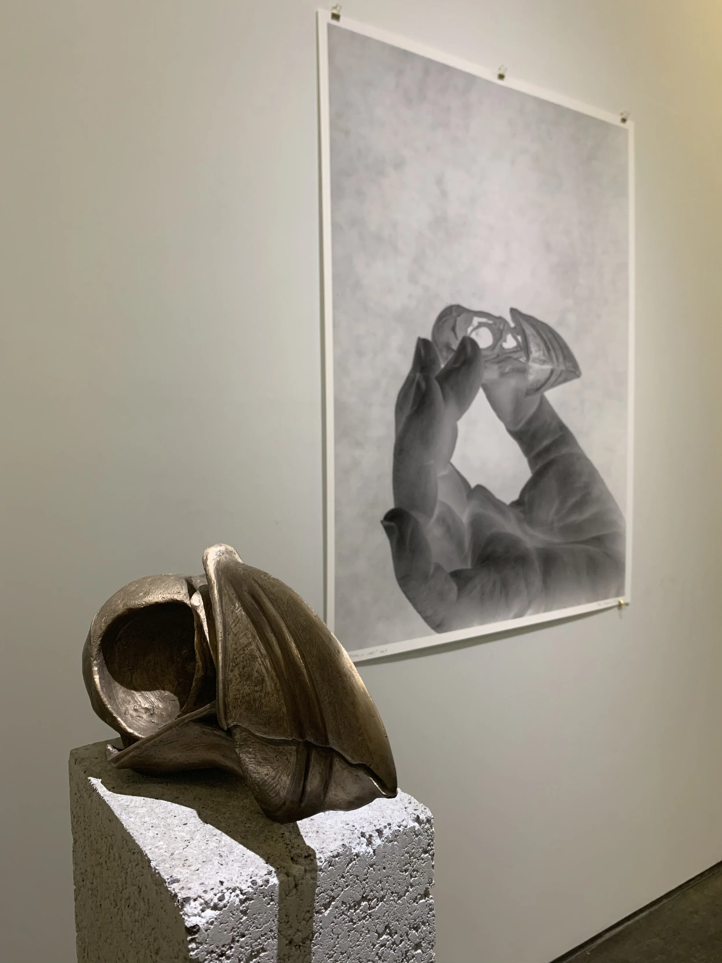 Skulptur av Elena Engelsen, Fragile Lives No 1, 2019 og fotografi av Per Maning, Fragile Lives No 1, 2019. Galleri Brandstrup. Foto: Tiril Sofie Erdal.