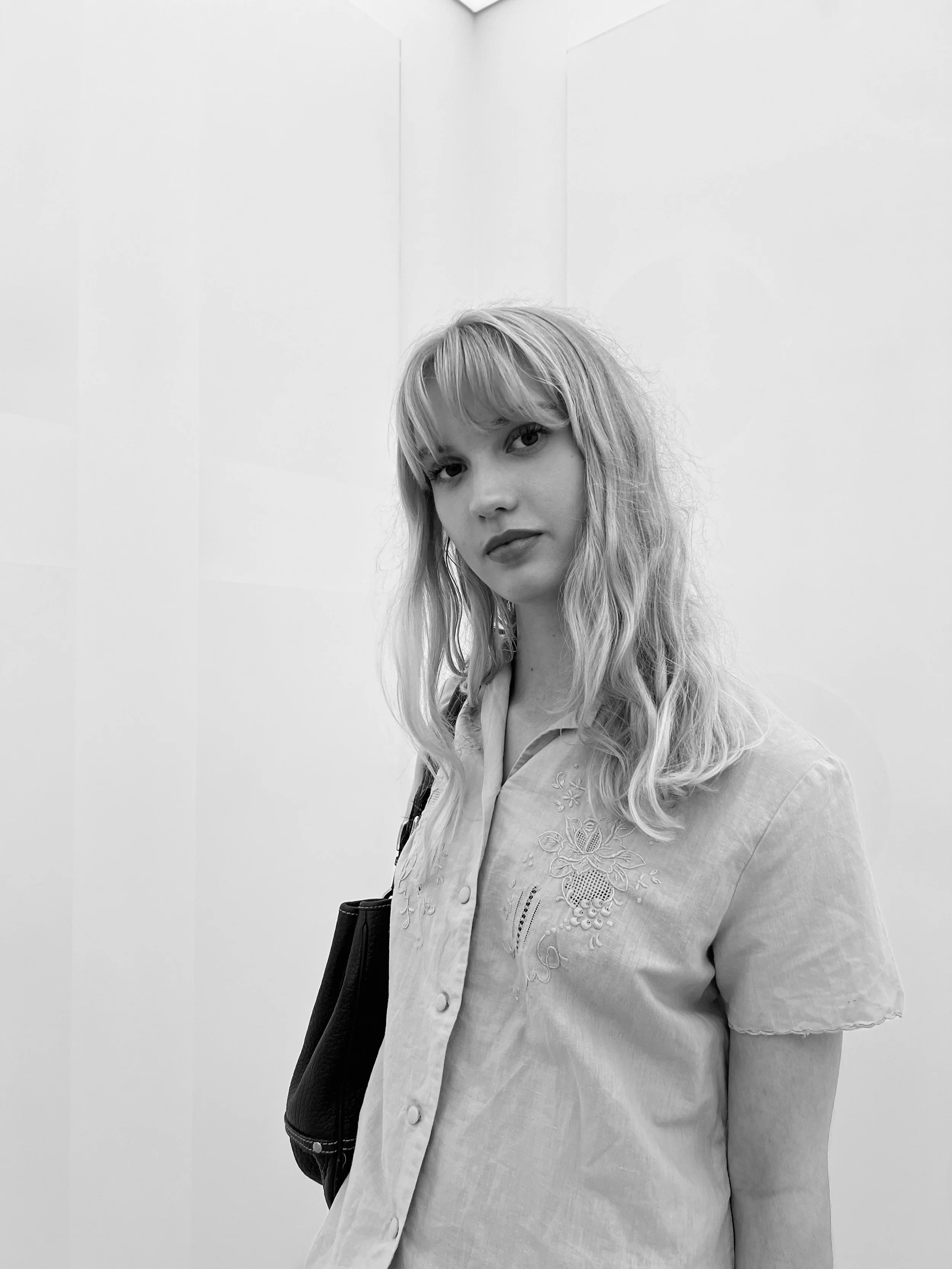 Karoline (f.2002) tar en bachelorgrad i allmenn litteraturvitenskap med fordypning i kunsthistorie. Har tidligere bakgrunn fra filmbransjen og stor interesse for det visuelle språket og historiefortellingen i både kunsten og litteraturen. Har ellers interesse for det tvetydige i forbindelse med tolkning av kunst.