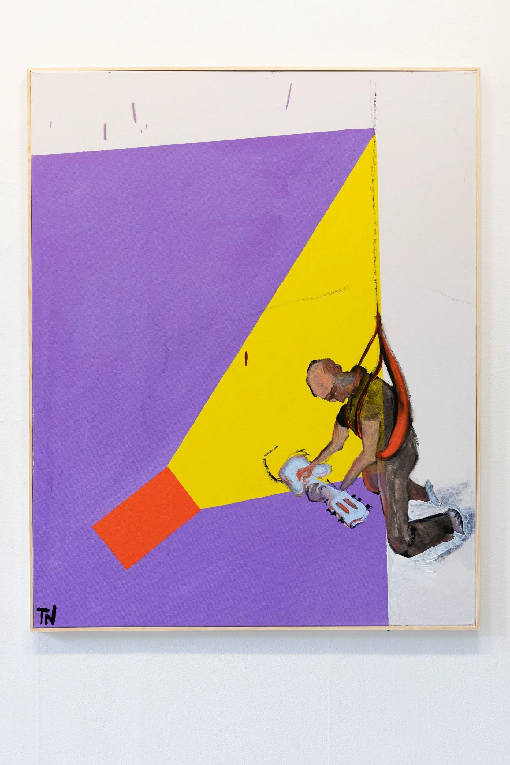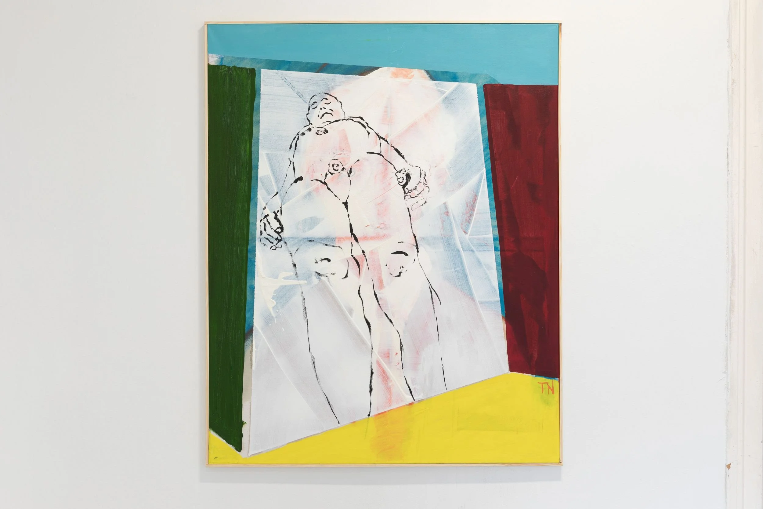 – Både og. Det er tydelig at utstillingen har et narrativ, men dette er et produkt av noe jeg kaller “post-rasjonalisering”. Meningen skapes i etterkant av at verket er laget, narrativet er der jo for å kunne formidle prosjektet til andre. Mye av det jeg har laget her er litt sånn: aha, så det kan hende at dette er det jeg tenkte på i det jeg lagde det! Det verket bak her er faktisk et gammelt portrett jeg har malt over. Jeg malte over det med et hvitt felt, så malte jeg over det igjen ut ifra bilde jeg tok av meg selv. Jeg tok bildet av meg selv med tåa fra dusjkabinettet, det er en interessant vinkel, sier Terje og ler