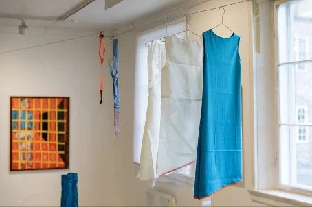Vi blir informert om at plaggene som henger på linen er laget med mange ulike materialer. Noen med stoffer fra Grønland, andre med partyteltduk fra Biltema. Og sist men ikke minst, får vi se på et slips av presenning - klippet rett ut!
