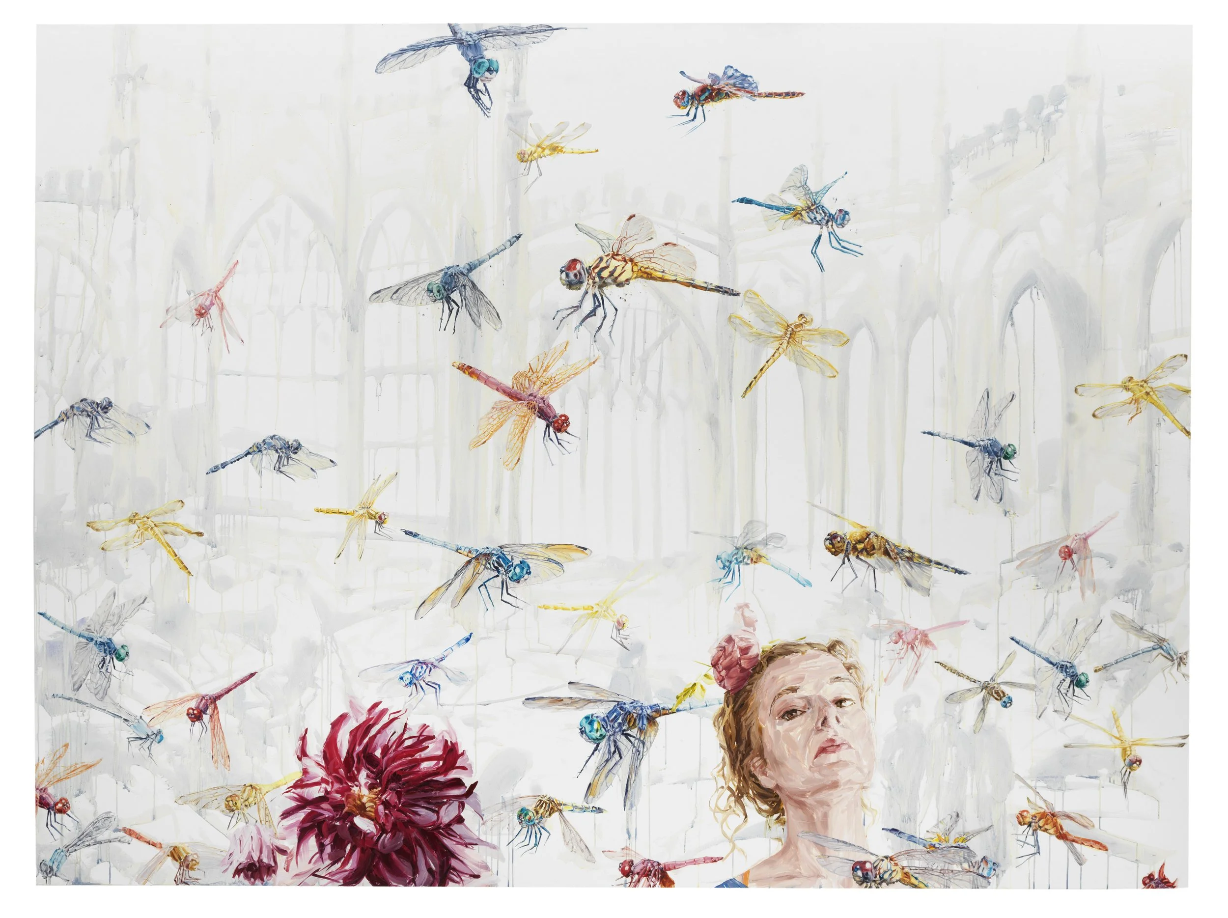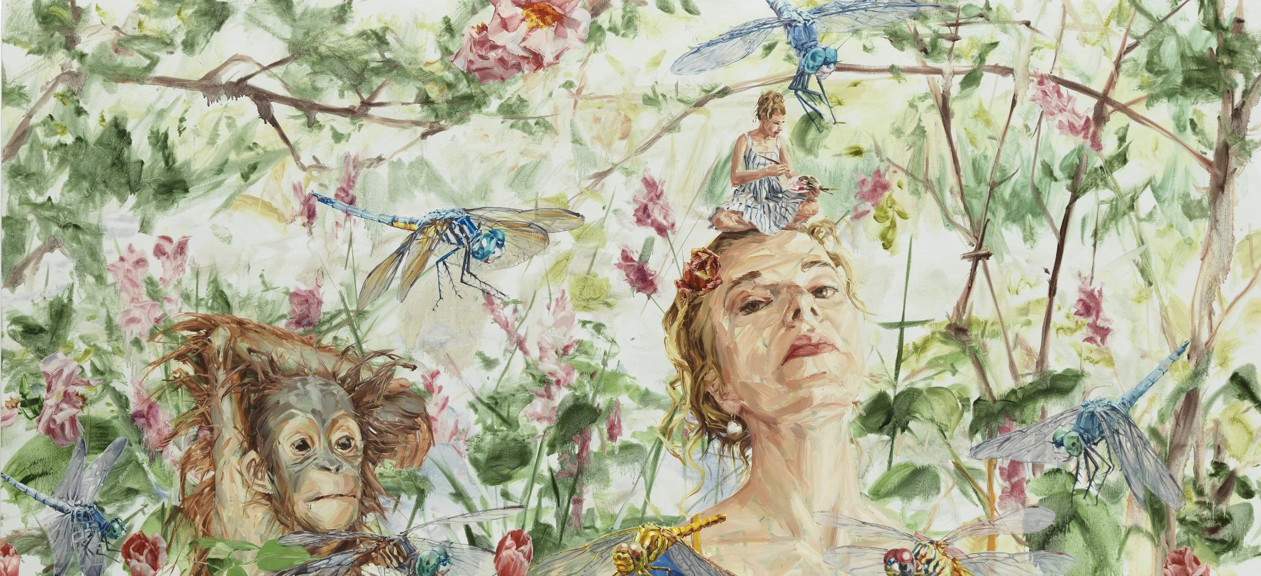 Målaren henger på en vegg for seg selv. Det er et figurativt verk med to selvportrett av kunstneren i høyre halvdel og en liten apekatt på venstre side. Både blikket til kvinnen og apen er hevet på en nedlatende og usikker måte mot betrakteren. Rundt dem er et fantasilandskap fullt av grønne grener, store rosa blomster og øyenstikkere. I forgrunnen er det et preg av realisme som vokser seg fra nederste billedkant og oppover i bildet. Lenger bak i verket er det uklare og diffuse linjer og farger, og bakerst er det et tomt hvitt rom. Det er en fremstilling av en ukjent verden som kan tiltrekke visse og skremme andre.