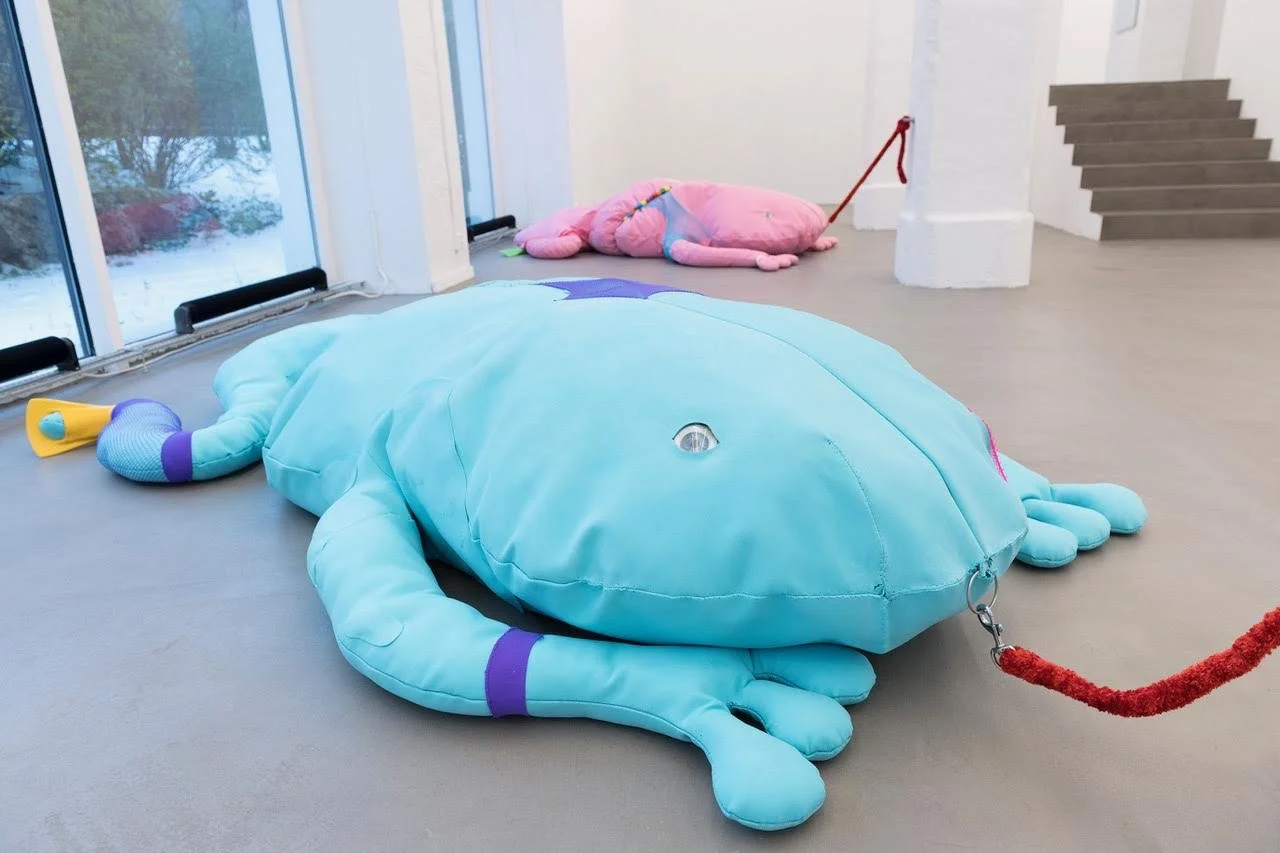 De to amfibieliknende, håndsydde skapningene som utgjør verket Moored i det tredje visningsrommet er fortøyd til hver sin søyle. De stirrer på meg med Carr sine øyne i det jeg går ned trappen: «Big Amphibia is watching!», tenker jeg. Det ene amfibiet har et forstørret 80-talls armbåndsur rundt bakdelen. Tikkingen fra klokken fremkaller en slags frykt, for jeg får plutselig for meg at noe snart skal skje. Kanskje venter jeg på at skapningen skal reise seg til min øyehøyde. Dette litt ubehagelige møtet med den myke skulpturen, skyldes at den som et oppskalert leketøy minner meg på fraværet av den kontrollen jeg ellers innbiller meg å ha over objekter. I forstørrelsen til Carr tilegnes leken på den mest konkrete måten en egen livskraft, og kan nå ikke lengre motta en filleristing av barnehender. Dette fetisjistiske aspektet ved oppskalerte leker er ikke et ukjent farvann for Carr etter Høstutstillingen i 2017, der bronies flokket seg til Kunstnernes Hus for å få et bilde med hennes forstørrede My Little Ponies.