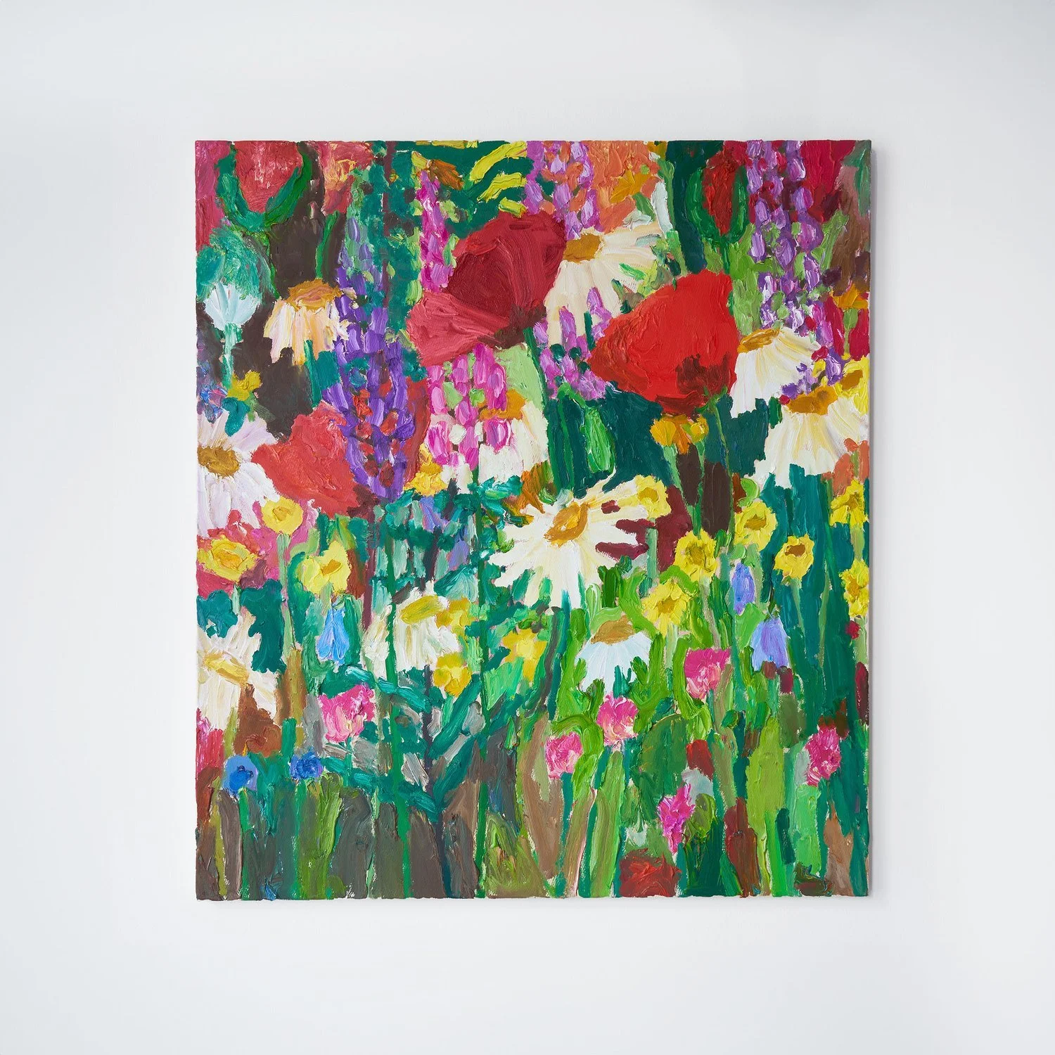 Idet jeg trer inn i lokalet, fanges blikket mitt umiddelbart av A poem for my son av Liv Ertzeid. Det store maleriet henger rett overfor inngangsdøren og er slående av flere grunner enn bare størrelsen: det er fargerikt, og likevel naturtro. Valmuene og de grønne knoppene som ennå ikke har blomstret, får meg til å tenke på våren, og jeg glemmer øyeblikkelig den bitende vinterkulden utenfor galleriet. Behagelige, duse pastellfarger i bakgrunnen står i kontrast mot de oransje-røde blomstene, og får motivet til å stå ut fra lerretet på en iøynefallende måte. Ertzeid fortsetter med den botaniske tematikken i sine to andre malerier: How much flowers do you need? More thank you think og The sound of June. Blomster malt tett i tett, og de virrende fluene blant blomsterstilkene gir assosiasjoner til viltvoksende blomsterenger og varme vår- og sommerdager.