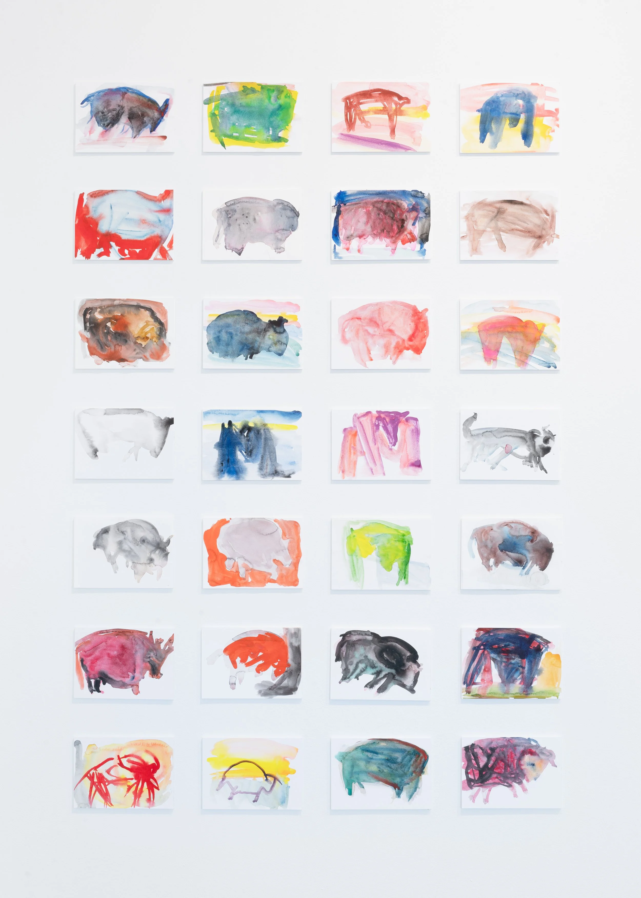 Haarrs arbeider i utstillingen er energiske, uttrykksfulle, og ikke minst mange. Utstillingen huser nemlig flere hundretalls små akvareller under tittelen Å male dyr om natten, med gjennomgående spreke farger og grove, spontane penselstrøk. Samlet utgjør de en slags visuell dagbok inndelt i seksten kapitler, der alt fra kameler og ur- okser, foreldreløse barn, krig, blomster, forbilder og barndomsminner blir temaer i en personlig fortelling om Haarrs liv, ytre påvirkninger og egne opplevelser. Som i en dagbok knyttes de ulike fragmentene sammen og forteller bruddstykker av historier fra Haarrs eget liv. Det er fascinerende å få se innsiden av en slik personlig fortelling, samtidig som den på en lekende måte inviterer betrakteren til å koble på sine egne erfaringer og assosiasjoner.
