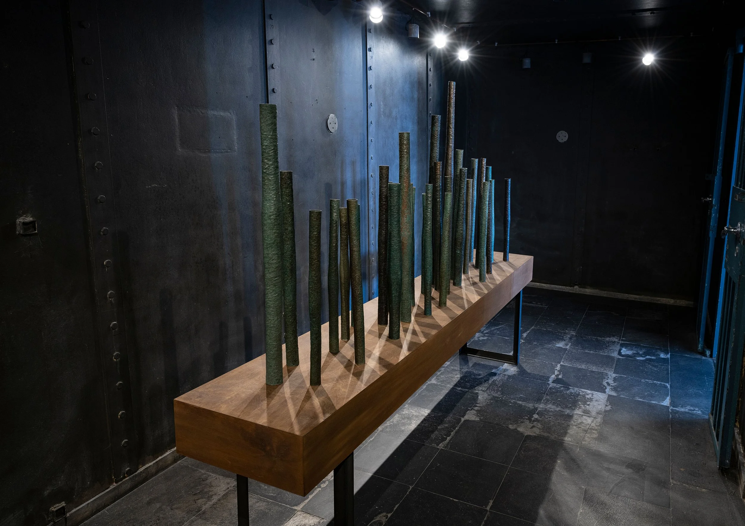 – Noen arbeider er direkte inspirert av skogen, Møter (det var mørkt men jeg følte meg trygg), f.eks, som er kobberrør som er hamret og patinert i forskjellige grønne og blå farger. Og det er jo direkte inspirert av skogen, selv om det ikke er noe tre i det arbeidet. Og der handler det om det møtet når man kommer til begynnelsen på en skog. Og det bare er sånn tett i tett i tett, og det ser helt rett ut, samtidig som at alt beveger seg og alt har sin egen form. Jeg ser mye på hvordan trær har falt i skogen og setter seg fast i andre trær. Men også noen ganger så ser jeg hvordan det har formet seg, eller hvordan det former seg rundt andre ting. Jeg har sett en del på epletrær, for eksempel, som er på vei til å falle, men som blir støttet opp og bundet sammen to og to. Eller pinner som brukes til å støtte dem opp. Og denne tvangen i at man får naturen til å fortsette. Den vil egentlig ikke, men den må fortsette. Og det blir kanskje ganske synlig i mange av arbeidene jeg lager. For det er på en måte den menneskelige tvangen, inngrepet i naturen, som jeg synes er veldig spennende. Man lar ikke naturen gå sin gang alltid.