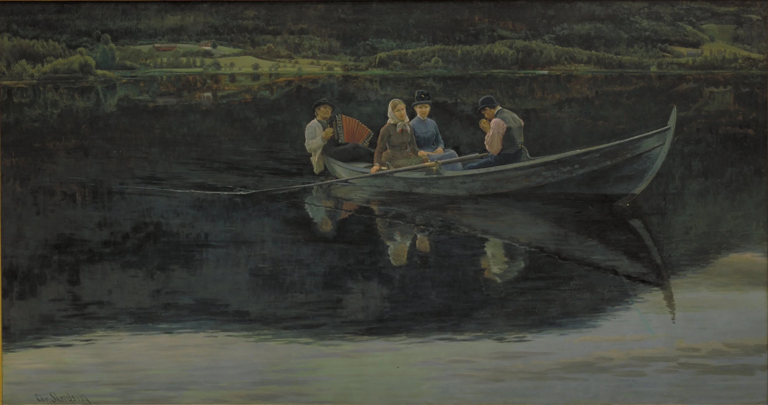 Utstillingen er delt inn i områder, med vegger i ulike farger og belysning. I hver del henger et lite utvalg malerier i store og høytidelige gullrammer. Vi får omvisning gjennom avdelingene, der hver del har sin historie. Først blir vi tatt med til salongen i Paris, der Skredsvigs tidlige verker ble utstilt. Store lerretter med detaljrike dyremotiver av hester og kuer fyller veggene. Vi går videre til et av hans mest kjente malerier, Sankthansaften (1886) (ill. 1), som visstnok ble en “hit” i Paris. Det overveldet meg positivt med sin størrelse og åpne komposisjon. Her introduseres en enorm vanspeiling, som går igjen i mesteparten av maleriene i utstillingen. Motivet viser en båt med tre figurer, men det er vannet som står i fokus. Himmelen gjør kun en inntreden gjennom vannspeilingen. Komposisjonen uten inngang og størrelsen på maleriet, gjør at jeg blir dratt inn i motivet og fylles av en stemning som minner om en sommerkveld.