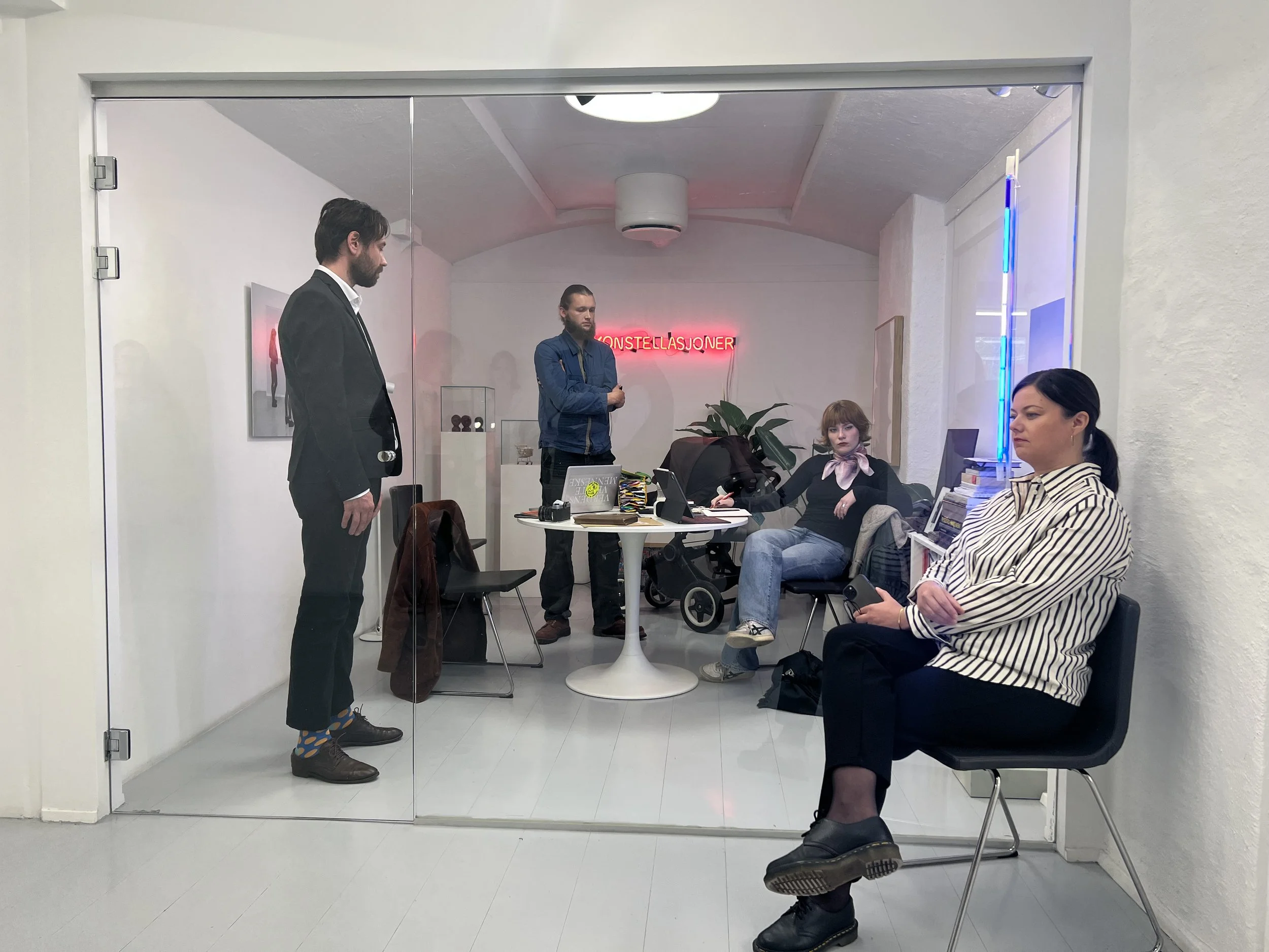 På den ene siden av det avlange rommet, vis-à-vis en lang blank vegg, befinner det kvadratiske gallerikontoret der dagens performance vises. Jeg står bakerst mot den tilsvarende hvite veggen og observerer fire vanlige mennesker, tre inne i et kontor og ett utenfor, sitte urovekkende stille og urørlige som om de var forsteinet. Scenen jeg opplever å tyvtitte på ser ut til å være et slags møte. En meter foran meg sitter det en voksen kvinne på en stol, og helt stille som fryst i tiden stirrer hun ut i intet; som om jeg og de syv andre menneskene en armlengde foran henne ikke eksisterter. Bak henne vedvarer det kubeformede kontoret med en glassvegg mot betrakteren. På den andre siden av glassveggen sitter det en kvinne med blikket vendt ut og vekk fra to menn som ser ut til å henvende seg til henne. En av mennene er iført i dress og den andre i hverdagslige klær og arbeidsbukse. Sistnevnte står med armene i kors, og det kan tenkes at det er ham barnevognen plassert bak tilhører. Fotografiet av installasjonen Live Photo #26 Lillestrøm på veggen, det analoge kameraet på bordet, den dekorerte macen med «verdens verste menneske» og «Blast Skates» klistremerker, i tillegg den avslappede holdningen og trolig farsfiguren til mannen, kan alludere til et slags selvportrett av kunstneren. At kvinnene sitter og mennene står fascinerer meg, og da jeg spør Crispin om dette er han ikke helt sikker på hvorfor, men forteller meg at det er gjentagende i kunsten sin. Et slags oppgjør med etablerte stereotypiske kjønnsroller? Eller kanskje det er relatert til egne opplevelser av ett eller begge kjønnene?