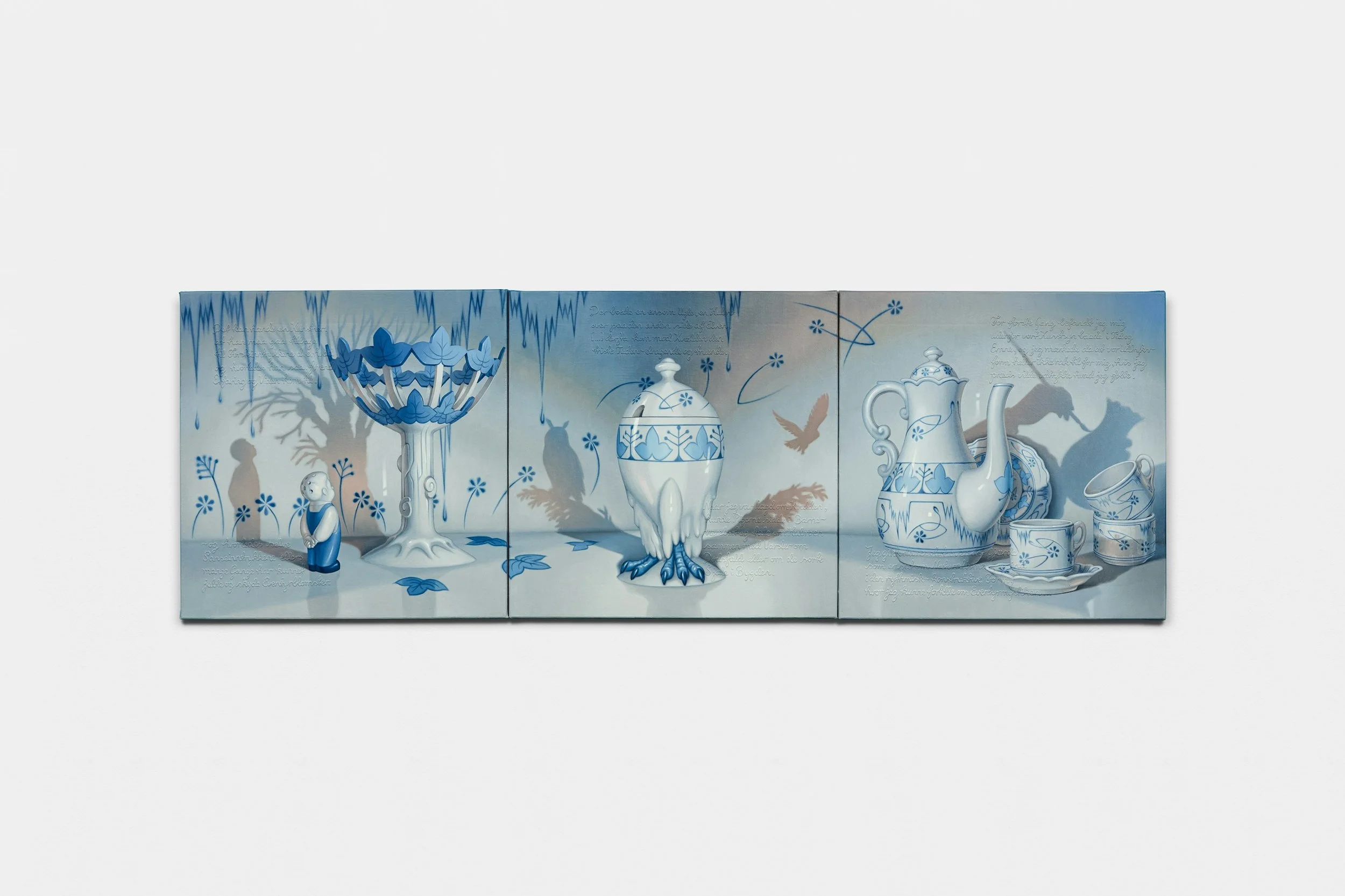 Jeg entrer utstillingsåpningen til synet av noen titalls mennesker som allerede hadde satt i gang denne ommøbleringen. Båsens estetikk, foreviget i maling på både lerrett og enkelte av gallerirommets vegger, forsterkes av settingen. Det kalde lyset og de hvite veggene blir nærmest paralleller til de polerte, nærmeste digitale, fiktive bakteppene i verkenes billedrom. I det man beveger seg fra ett verk til det neste, geleides man av en stabil visuell fortellerstemme. Hva den prøver å fortelle oss, er ikke umiddelbart meddelt. Gjemt bak puslespillbrikker, jordlag og knust porselen, stikkende ut fra en Matrojska-dukke eller anskueliggjort av et magisk skyggespill, skimter vi bare glimt av fortellinger uten ende eller slutt.