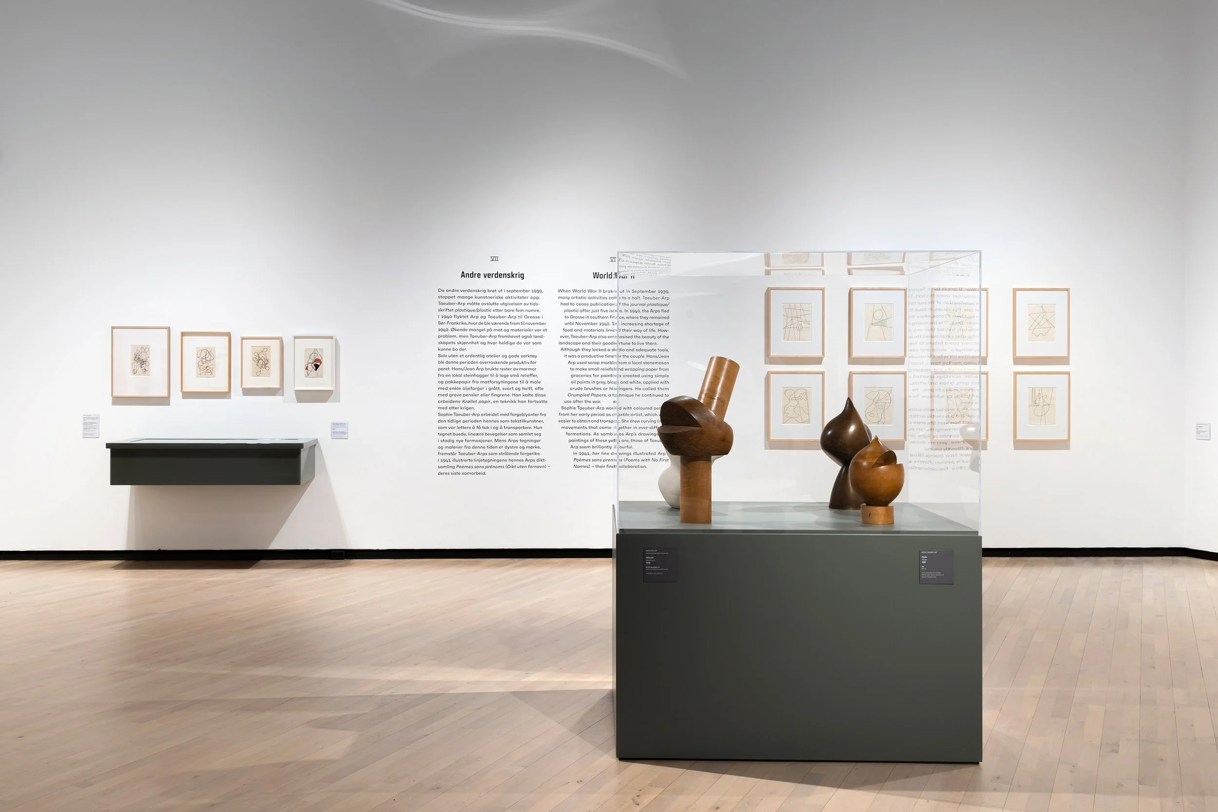 I den neste fløyen blir vi møtt med tegninger Hans/Jean Arp og Sophie Taeuber-Arp samarbeidet om. Åtte abstrakte grafiske verk med lekene streker og en overraskende god flyt av geometriske og organiske former. Strekene flyter inn i hverandre og jo lenger jeg ser på dem, jo vanskeligere blir det å forstå hvem som har tegnet hva. Det er nettopp dette som gjør deres sammensveisede kunstnerskap interessant. Like ved tegningene står det fire skulpturer i tre av samme slag – organisk & geometrisk i ett. Kuratoren Krupp forteller oss at det er for et utrent øye nesten umulig å skille hvem som har laget hvilken del i disse skulpturene. Jeg ser det ikke, men jeg mistenker at det heller ikke er meningen. Det jeg derimot ser, er en kunstnerisk symbiose der deres emosjonelle og romantiske bånd – klisjé som det høres ut – kanskje er den største drivkraften bak.