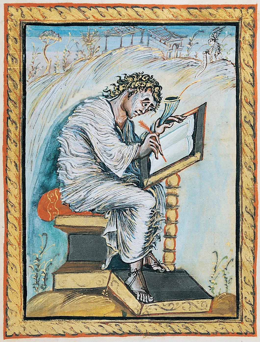 UKJENT KUNSTNER, Saint Matthew, folio 18 verso of the Ebbo Gospels (Gospel Book of Archbishop Ebbo of Reims) (ca. 816-835). Frankrike. Blekk og tempera på pergament, 10 1/4” x 8 3/4”. Bibliothèque Municipale, Epernay.