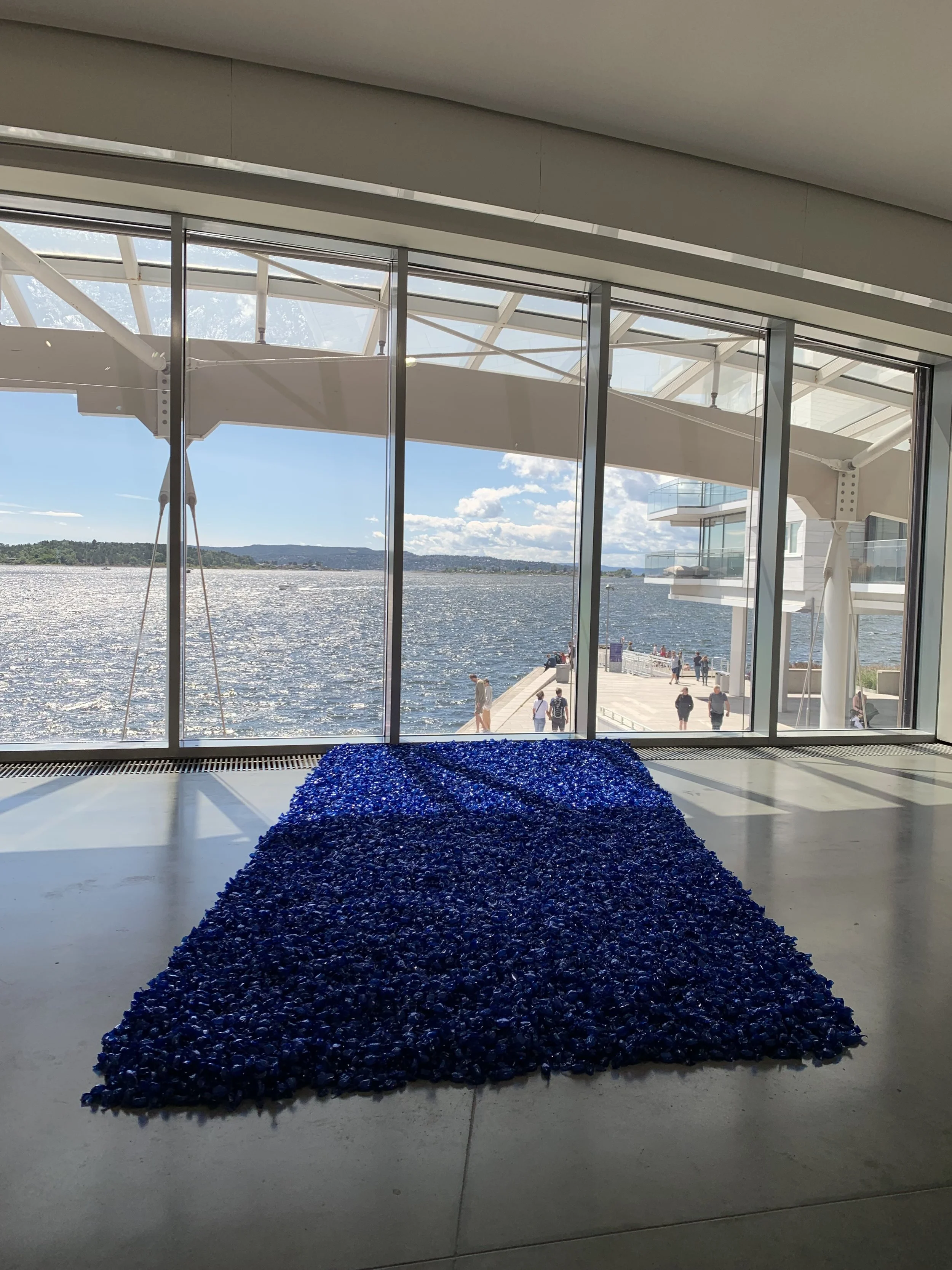 The piece rests upon the floor at the second level of the Astrup Fearnley Museet, seemingly slightly detached from the other works comprising the exhibition. Shaped in a parallelogram by the window, the form suggests a subtle sense of movement. The pseudo-duration of the work is conditioned by the visitors, encouraged to take a piece of the candy. The spill consists of 130 kilograms of the latter, wrapped individually in a pulsing blue wrapper, in the distinct minimalist visual vocabulary of the Mexican artist Félix González-Torres. The sheer appearance doesn’t really shock the eyes. Affirmed by the art world and the general public, especially embraced by the LGBTQ+ community, González-Torres’s artistry served as an advocate for HIV sufferers, and of protest against the established structures surrounding the social, political, and personal dimensions of the AIDS epidemic especially in the USA. Partnership, same-sex love, desire, and loss appear as leitmotifs in his work.