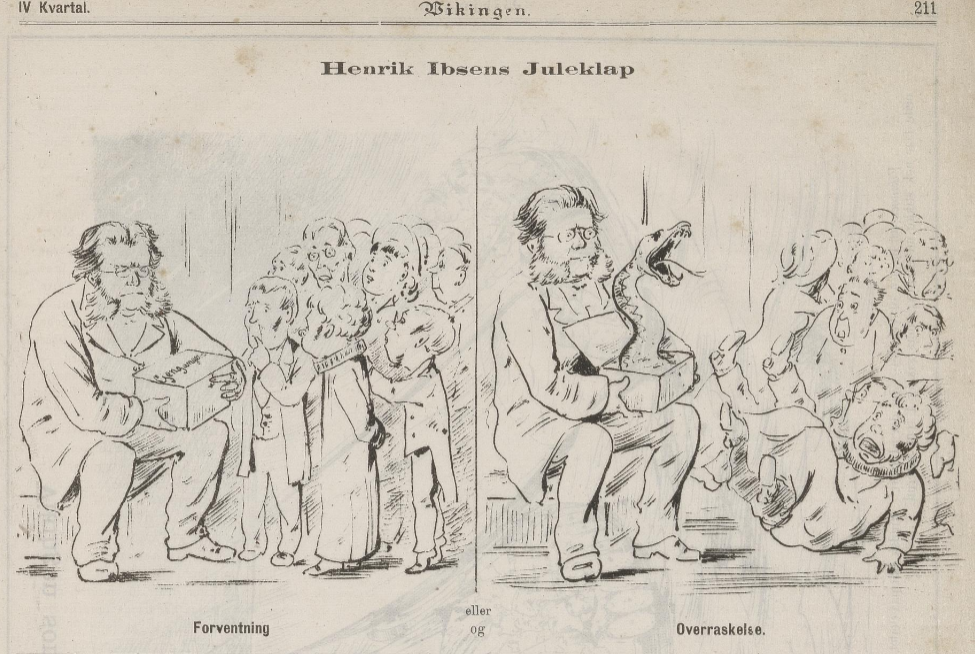 I en av de kjente Ibsenkarikaturene i tidsskriftet Vikingen (1881), ser vi hvordan Ibsen kunne sjokkere i samtiden. Her åpner Ibsen en julegave foran borgerskapet som først nysgjerrig titter frem, men så vettskremte faller om av den giftige slangen som spretter opp. Det rikt utsmykkede bokbindet sammen med Ibsens tekst, holder denne forestillingen levende for dem som har muligheten til å beundre disse små estetiske nytelsene.