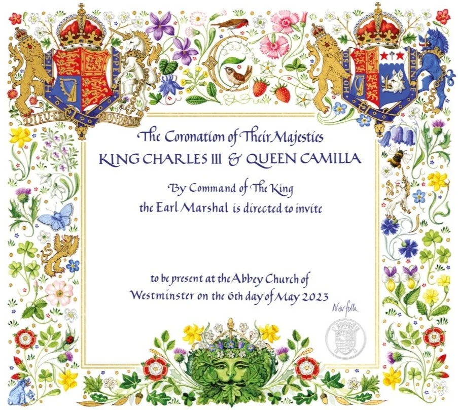 ANDREW JAMIESON, The Coronation Invitation (2023). Vannmaling og gouache. © Buckingham Palace