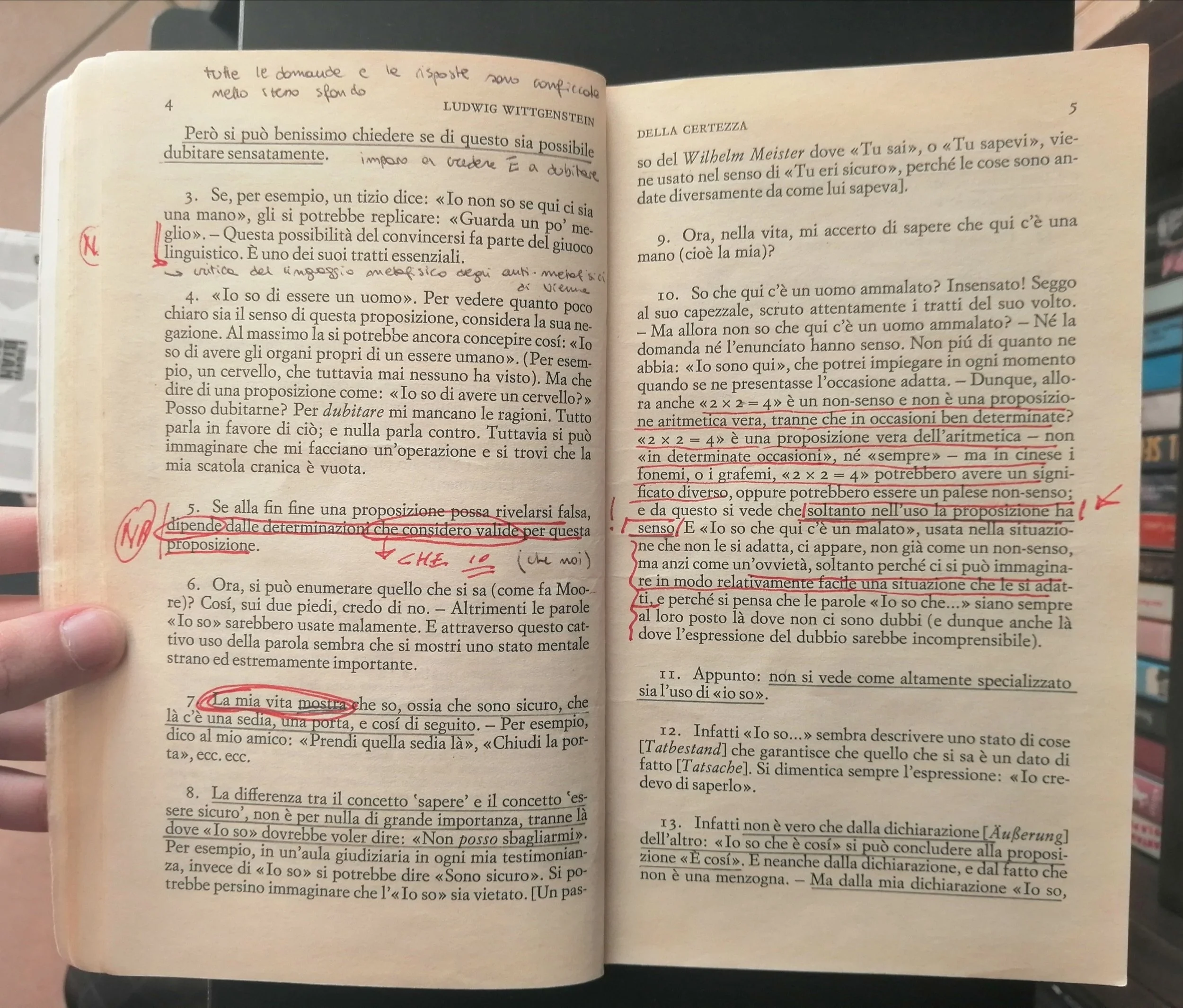 Elisa Mancioli, Two sets of annotations on Wittgenstein's Della Certezza, Milan, Italy, April 1st, 2026. Photo: Elisa Mancioli.